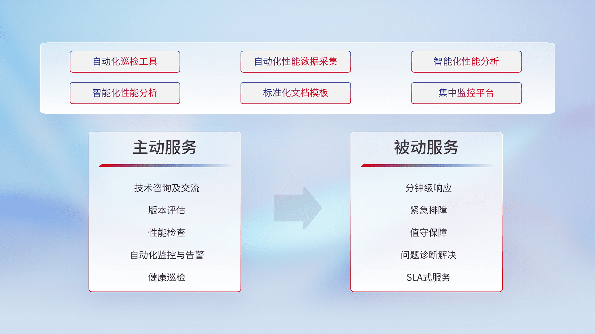 智能化工具和标准化文档,,,,保障服务质量,,,提供主动服务(包含技术咨询、、版本评估、、性能检查、、自动化监控与告警、、健康巡检)和被动服务包含(分钟级响应、、紧急排障、、、、值守保障、、、、问题诊断解决、、、、SLA服务)。。。。
