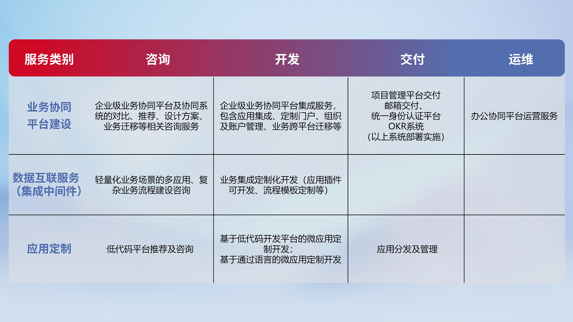 针对钉钉、、企微、、、、IDaas等平台级产品提供产品的规划、、、、方案、、交付、、定制化开发等服务,,实现如统一协同办公、、、智能客户服务、、、混合会议管理、、、、智能数据查询、、、、等业务场景,,,实现数字化转型。。